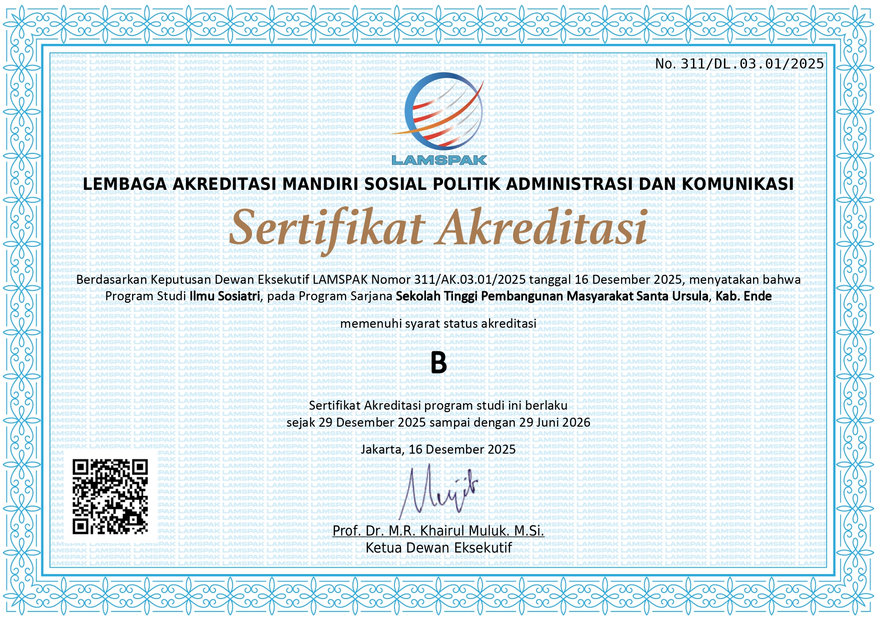 Sertifikat diberikan berdasarkan Keputusan Dewan Eksekutif LAMSPAK Nomor : 311/AK.03.01/2025, berlaku dari tanggal 29 Desember 2025 sampai dengan tanggal 29 Juni 2026.