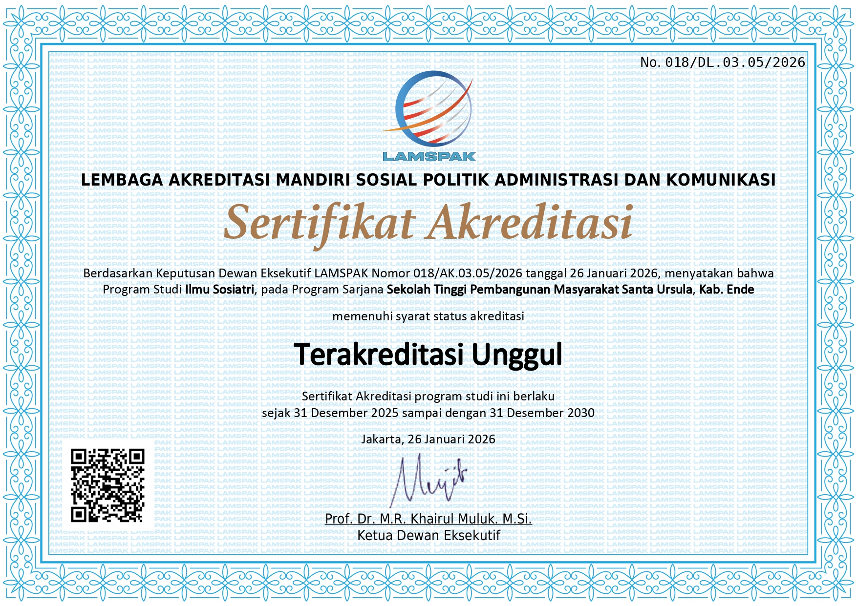 Sertifikat diberikan berdasarkan Keputusan Dewan Eksekutif LAMSPAK Nomor : 018/AK.03.05/2026, berlaku dari tanggal 31 Desember 2025 hingga tanggal 31 Desember 2030.